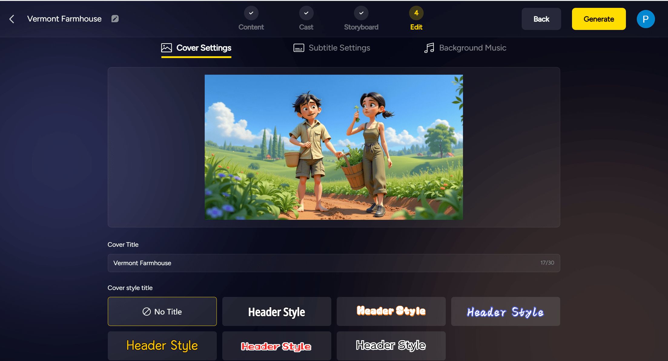 为每个场景查看并选择满意的配音。现在准备生成实际的卡通,点击“下一步”。在接下来的页面还有一些选项,比如可以选择给电影加标题或不加,可以选择在底部添加字幕,Magic light 会自动创建,还可以添加背景音乐。