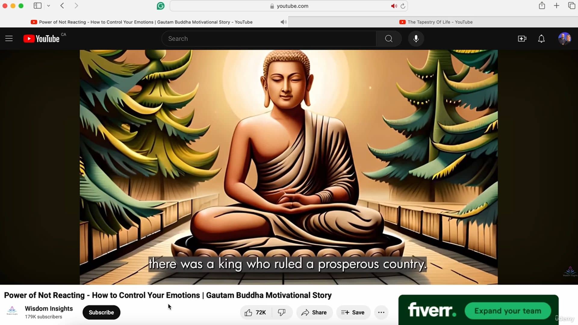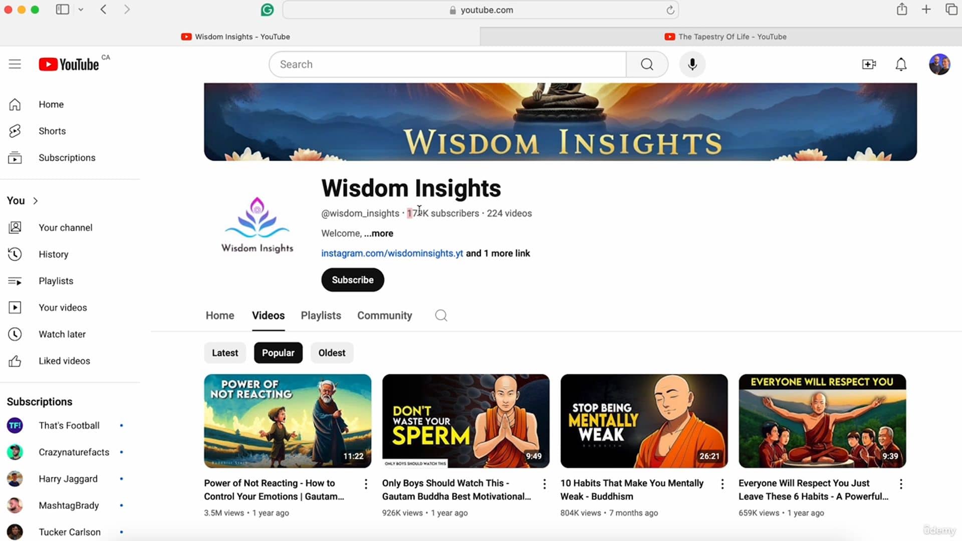 接着我们看看 “Wisdom Insights”(智慧洞见)频道。这是一个专注于分享智慧故事和名人名言的视频频道,订阅者数量达到17.9万,总视频数为224个。其中一个视频——《不回应的力量》,获得了高达350万次的观看量!这个频道的视频风格非常朴素,大多是静态图片加上简单的字幕和旁白,但内容往往富有哲理和教育意义。比如,他们从佛教故事中提取灵感,用 AI 生成文案,再通过工具配上解说和图片,这样既节省时间,又能吸引喜欢深思的观众。