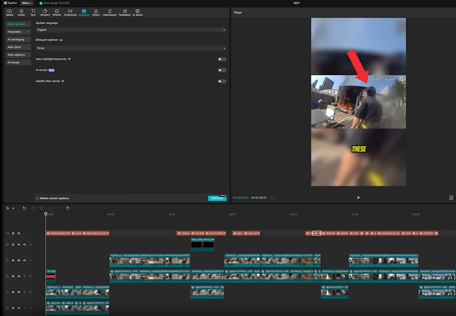 配音部分不用写复杂的脚本,我自己做的时候根本不写脚本,看着视频内容随口说就行。首先你得有个视频开头,和观众说清楚视频里要发生什么,这个视频的开头就可以说警察冲进着火的楼救一家人。之后你要在整个视频里都加评论解说,你可以拉进度条找视频里的关键节点,比如他们破门的片段,还有他们追着狗跑出房子的片段,这些都可以单独做一段解说。还有个片段是房主感谢警察救了他们的命,这个节点也可以加一段解说。你就针对这些节点分别录配音就行,我之前已经录好了几段配音,可以给你们听听看。“救完所有人之后,那家人感谢警察救了他们的命。房子烧塌之前,他们还要先把狗追出来。他发现门锁了,就直接砸了玻璃。这些警察冲进着火的房子救一家人。”这就是开头的配音,中间加这些解说片段,既能给内容增加价值,也能让故事更完整。