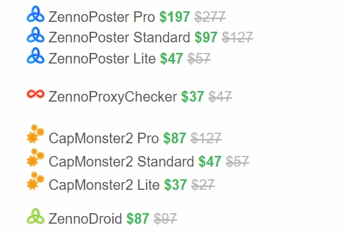 Zennoposter,可以简单的自己制作各种自动化脚本,可视化录制脚本,功能强大。采集、数据处理、发帖、各种自动化操作随你自己定义。我的博客就分享了很多的DIY脚本,例如自动邮件发送机,亚马逊采集,微博自动化等等,用处非常多。下面是产品和版本的黑五优惠活动价: