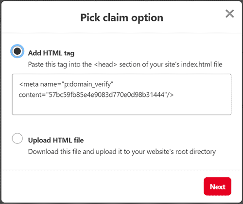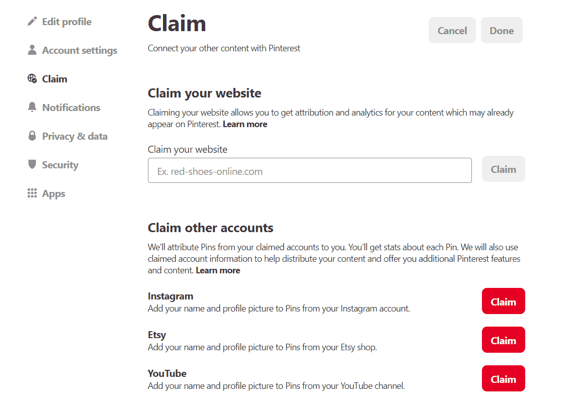Claim website,即向Pinterest证明你是某网站的拥有者,验证通过之后,你可以解锁很多新功能,比如可以看到从你网站Pin出去的图片帖子的成效分析等,也能让Pinterest更能理解你的业务,理解你的Pins。