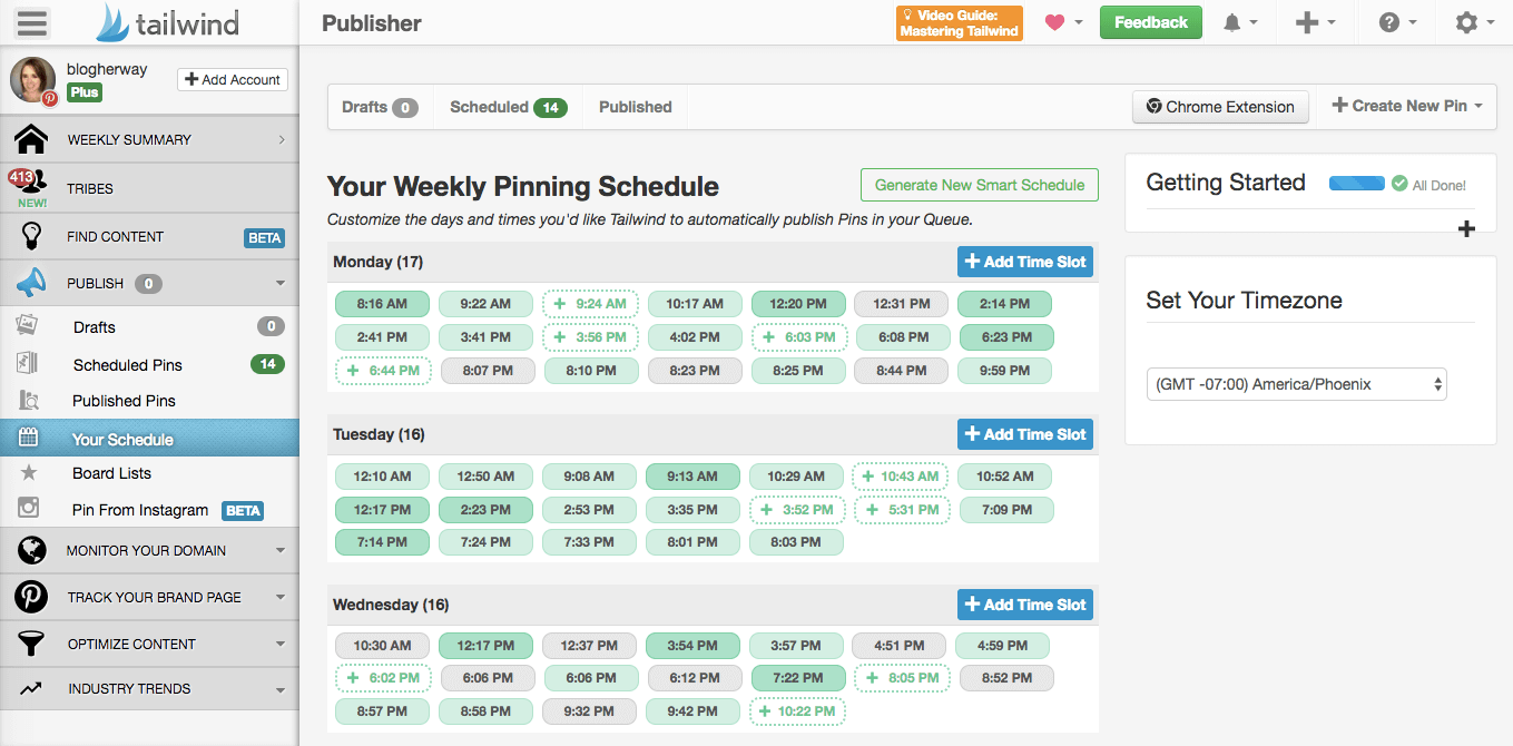 这里推荐一个工具:Tailwind,可以帮助你定时自动发布pin,还会提供你一些建议的时间点(这些工具独特好处就是具有大数据分析的作用),极大的减少你的劳动力,只要你设置好了内容,你可以长时间的省掉手工操作,而你的账号不会停止更新。