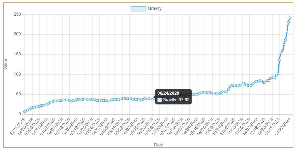要知道,特朗普的粉丝8870万啊,不管出于什么需求心理,支持?纪念?寻求安慰?总之,需求是非常大的。产品非常火爆。大家看一下,clickbank的gravity值,现在高达244(在clickbank上已经很高了),还在上升,大家看一下图:(可以自己到https://cbengine.com这个网站查哈)