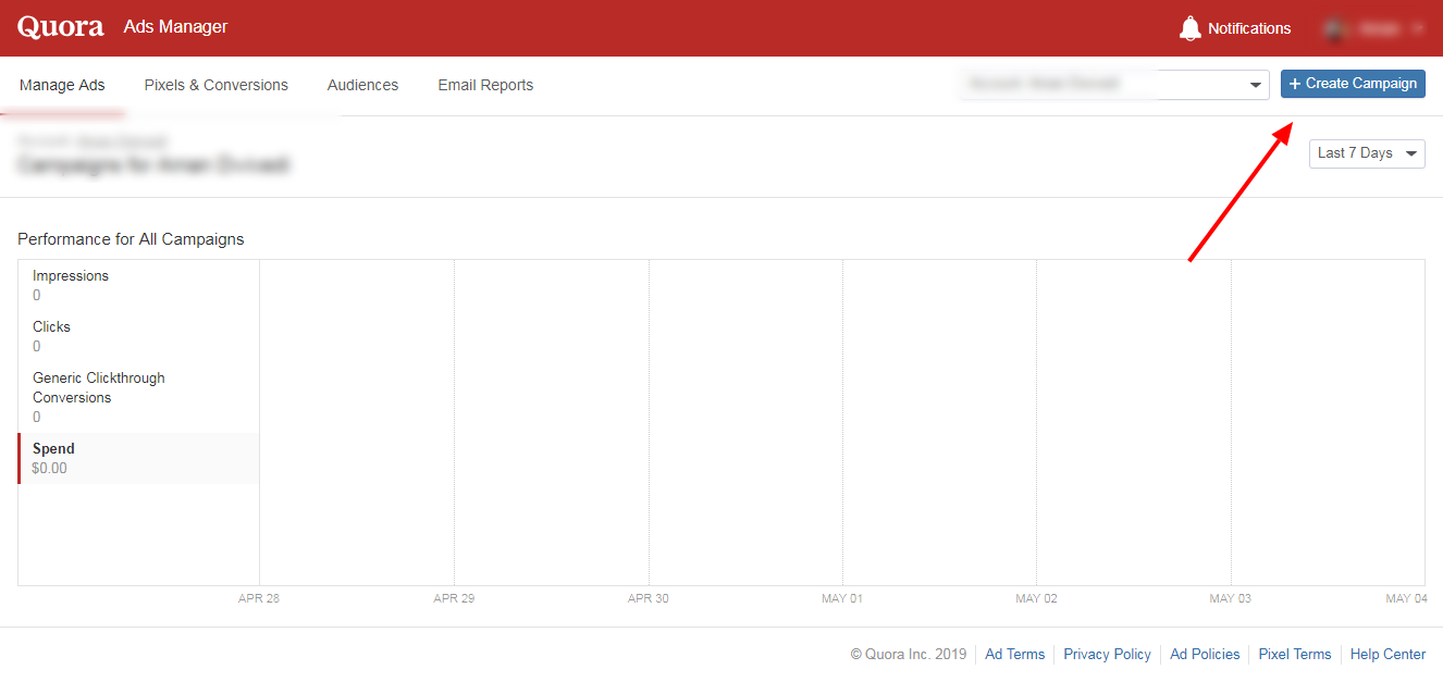 1、首先注册一个Quora账号,然后点击右上角头像点击 Create Ad 创建一个广告账户。