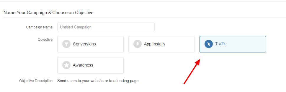 4、选择广告目标为 流量”Traffic” ,继续