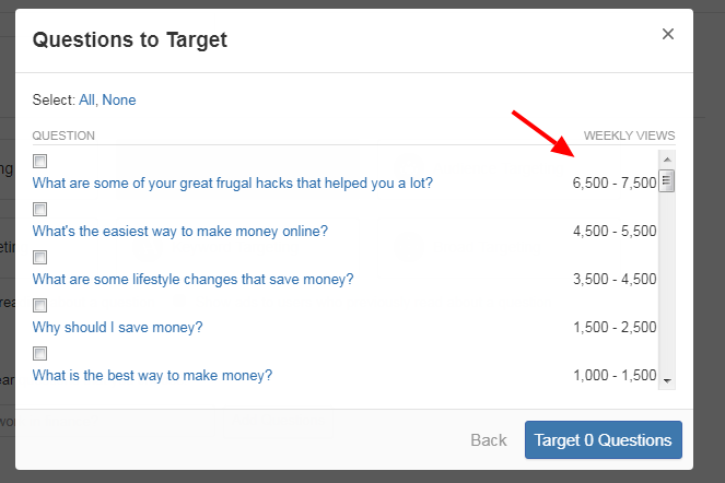 8、然后你会看到一些相关的问题,列出了每周大概的浏览量范围,这里可以筛出一些浏览量比较大的问题,例如每周1000-30000 的问题,点击打开