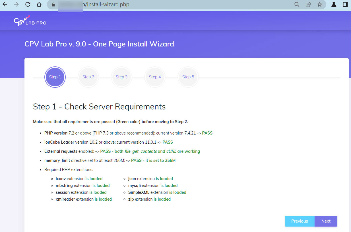 4、访问你的安装路径:YOUDOMAIN.COM/install.wizard.php,检查你的服务器是否符合要求,安装必要的组件,点击NEXT 进行下一步。