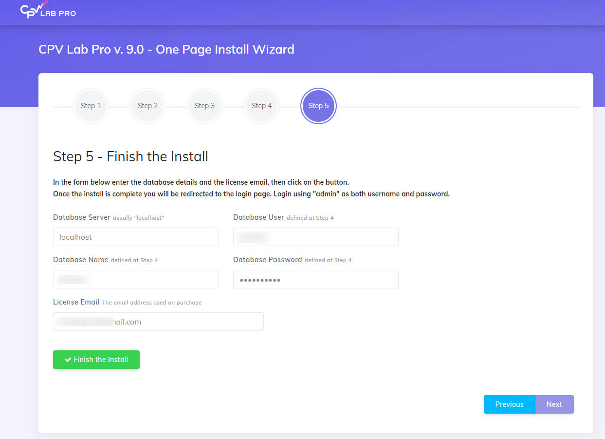10、填写好数据库资料,数据库名称,用户名,密码以及 License email后,点击 Finish the install
