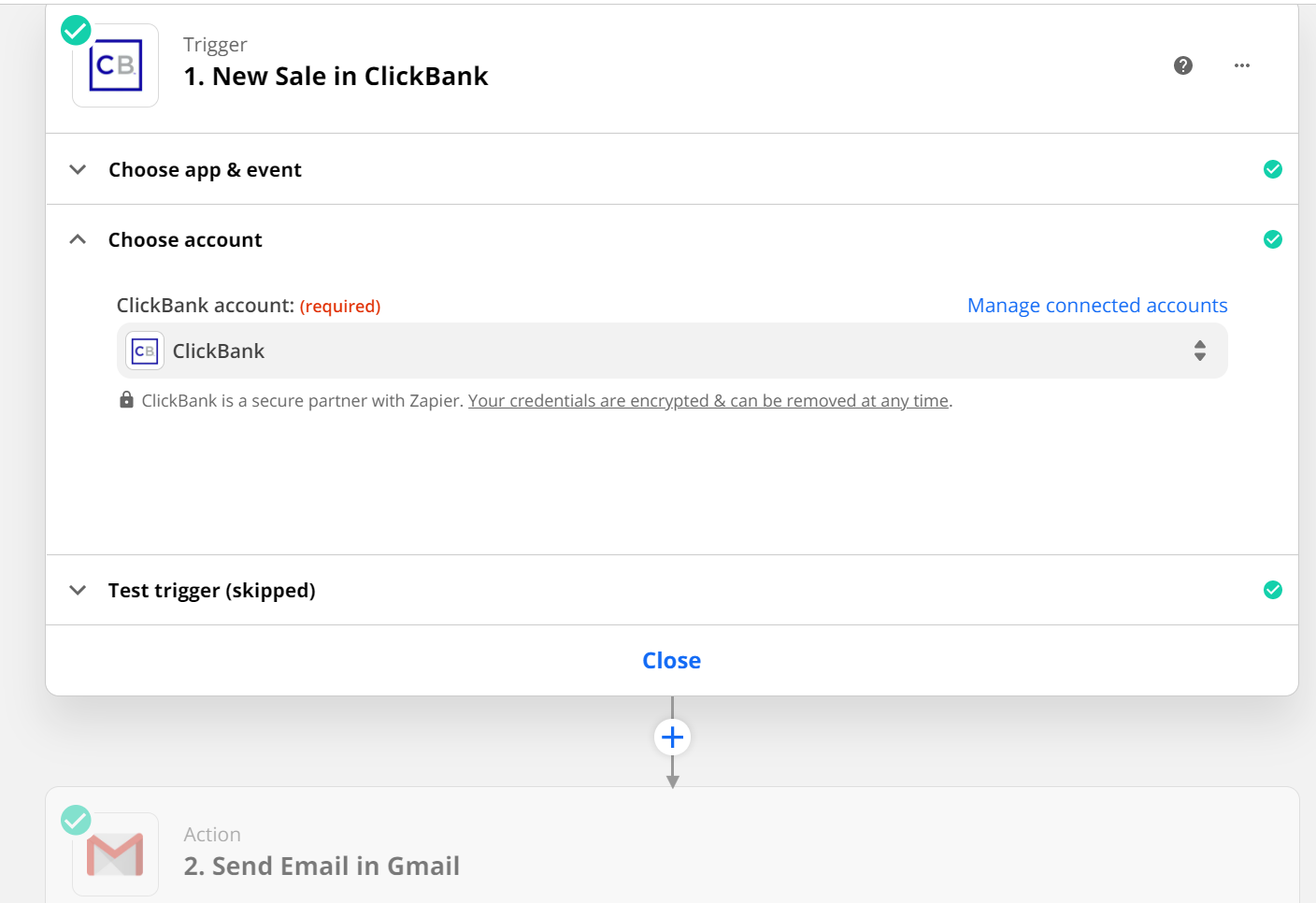 3、接着按照指引,登录你的clickbank账号,获得账号授权和连接,可以试着 test trigger ,测试一下是否能触发,也可以略过。