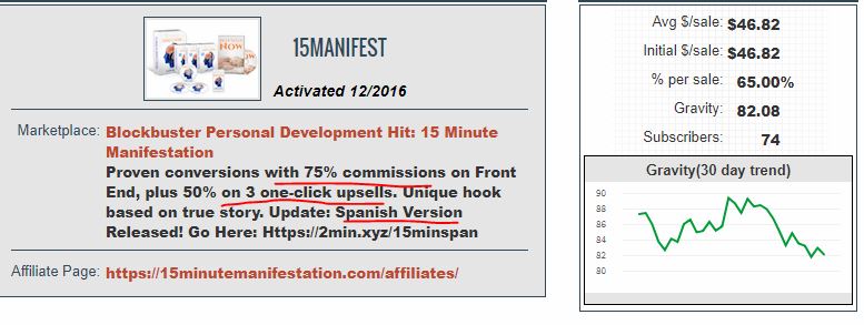 举个例子,我个人比较喜欢研究灵修(灵性和修心),经常孜孜不倦的看着方面的资料和文章,一点也不觉得累。所有我是很随性的,有时候很长一段时间也没怎么做事情,除了家人,其他人都不想接触,但是毕竟长久不“生产”也是不行的。所以,我就选择了一个冥想这方面的利基来做,在Clickbank上有好几个相关的产品,例如15minutemanifestation这个就还可以,gravity值一度超过100多,佣金75%,有三个upsale,而且还推出了西班牙文的版本,这都说明这个产品的市场接受度还是比较高的。我自己在这个产品上一直都有sale。