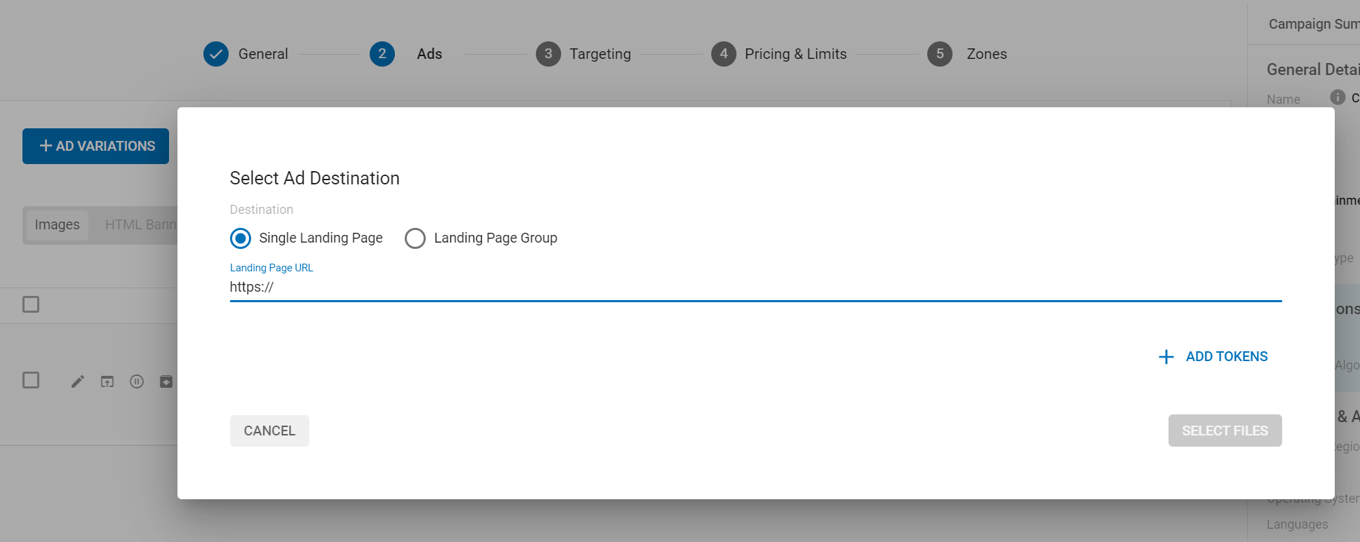 点击下一步, 来到 Ads 设置,点击 AD VARIATIONS(广告变体)输入 Landing page 的网址(提交审核前,确保Lander内容和设计完整,否则会被拒绝),然后上传 广告图片提交等待审核。