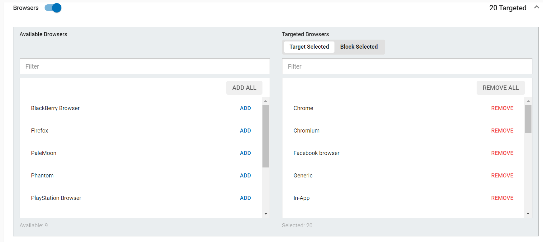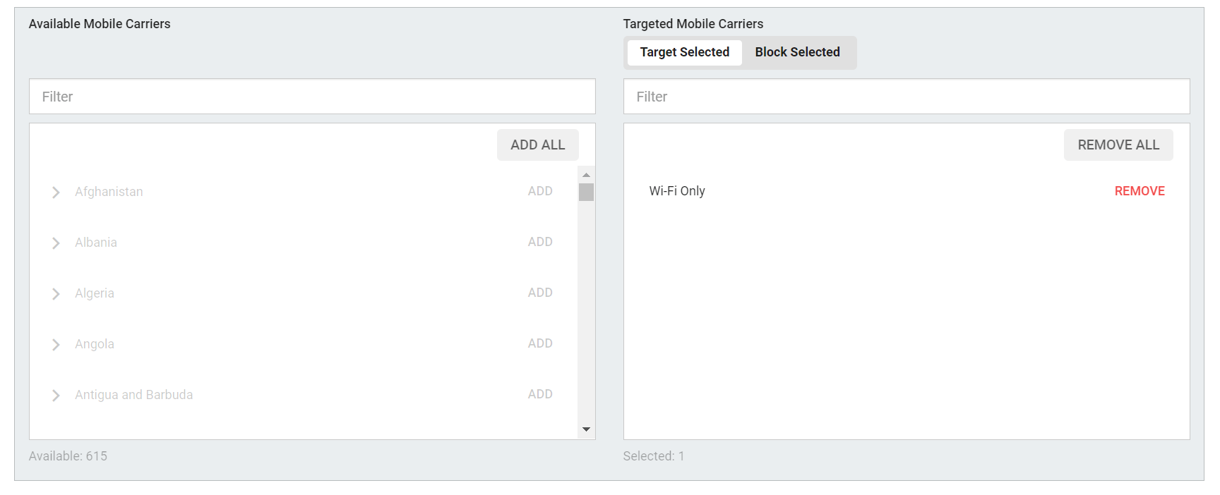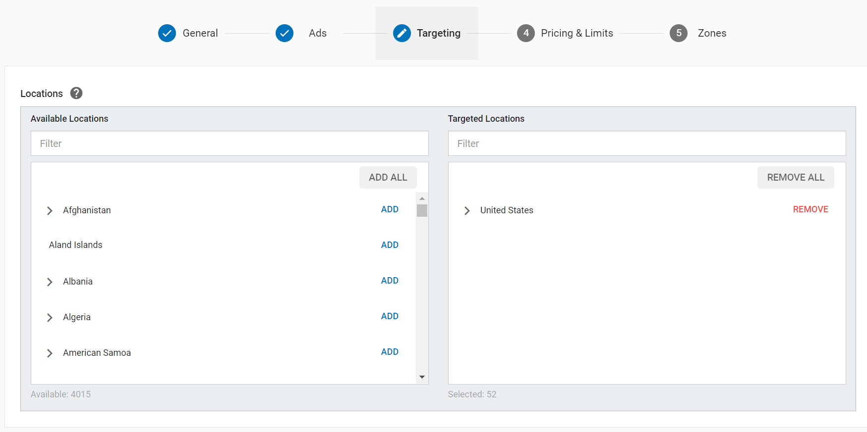 接着来到广告定位部分 Targeting,选择你要 target的地区,例如图例中选择了美国 – United states, 选择设备,运营商,浏览器类型等。