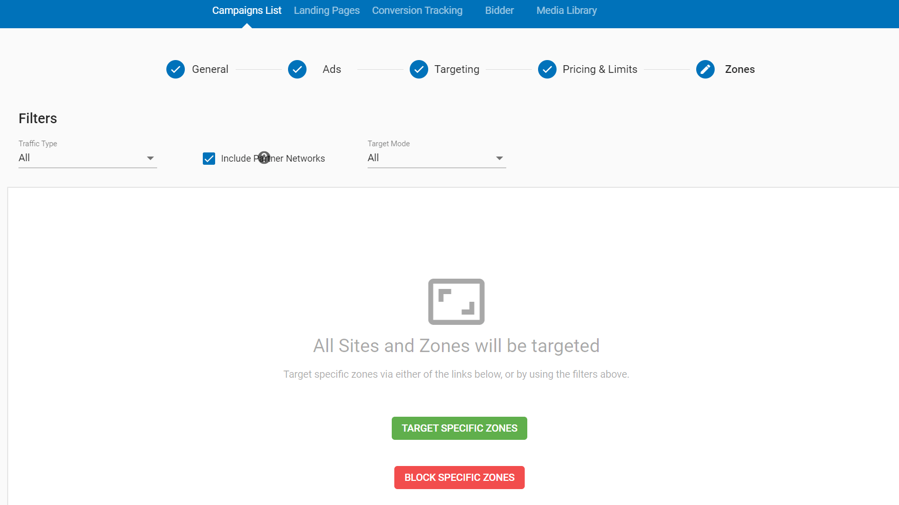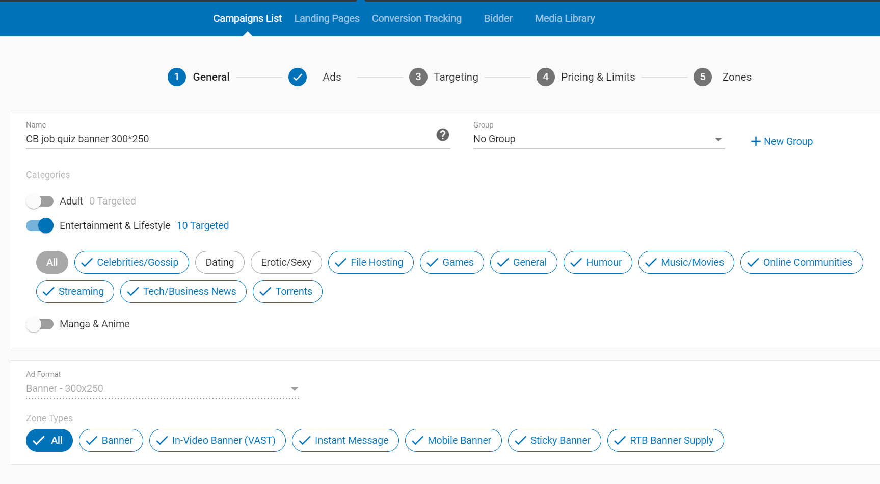 Zone这里是具体的广告位置,在Exoclick这个平台,很多网站是可以直接看到网址的,你可以根据campaign的测试结果,把具体的网站域名或者一个网站不同的广告位置,放入黑名单或白名单(只能选择一种),以提高项目盈利。