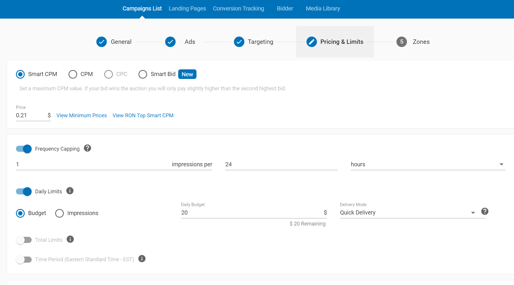 下一步是选择竞价方式和价格,不同的竞价方式特点不同,一般测试的初期,尽量选择 Smart CPM,(智能每千次展示费用,与CPM 相同,唯一的例外是,算法将自动调整最终出价,以使其比“你下方”最接近的竞争对手的出价略高一点,为你节省广告费用。