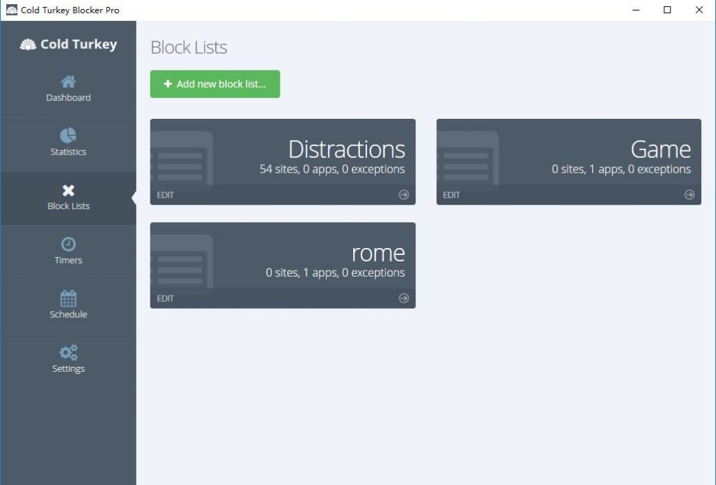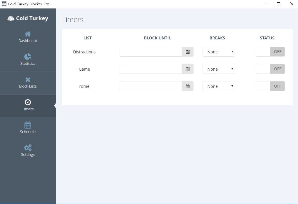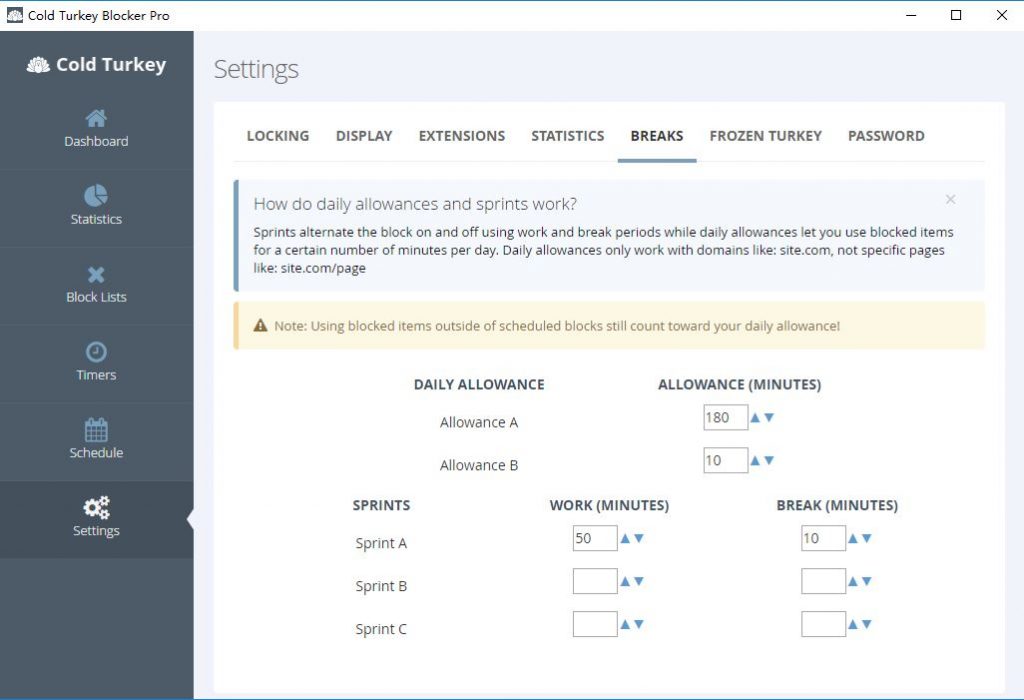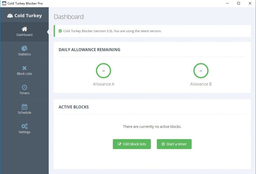 为了控制儿子用电脑(游戏和上网)的时间,想找一个记录和控制软件运行时间的程序,于是搜到了这个比较小众的软件:Cold Turkey,不但适合小孩,也适合懒散、拖延症成年人,觉得还不错,推荐给大家。