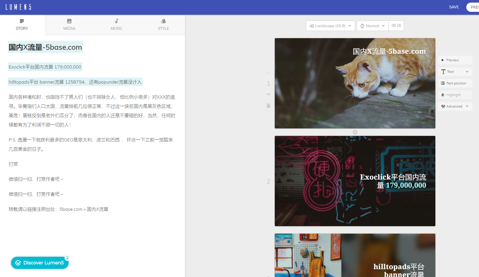 感觉和 Content Samurai 差不多,但是Content Samurai 还可以自动合成语音解说,lumen5.com 似乎不支持。