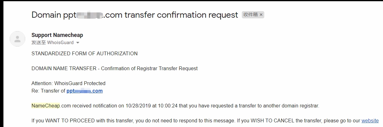 自己在namecheap后台解锁,提取授权码,即时就在邮箱收到了。然后填写到国内的交易平台,本来是显示1-7个工作日可以完成,但实际上第二天一早就收到了域名转移确认邮件,点击后,域名就转移成功了。在国内注册的域名,如果是转移还需要提交身份证扫描,甚至更早还要传真,肯定没有这么方便的。