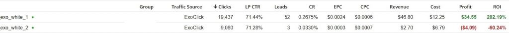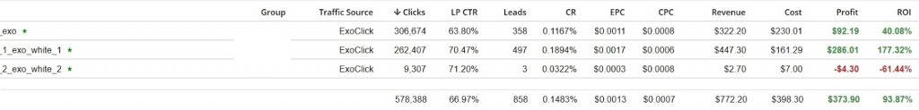 All the numbers below include click loss (loss of traffic between its source and tracker). The main campaign (exo) had clickloss rate of 9%, exo_white_1 had about 6-7%.