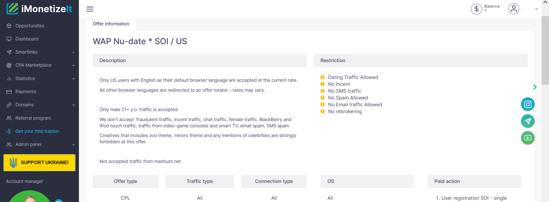选择了针对美国市场的Nu-date SOI offer,注册费用为2.56美元。只接受21岁以上男性流量。