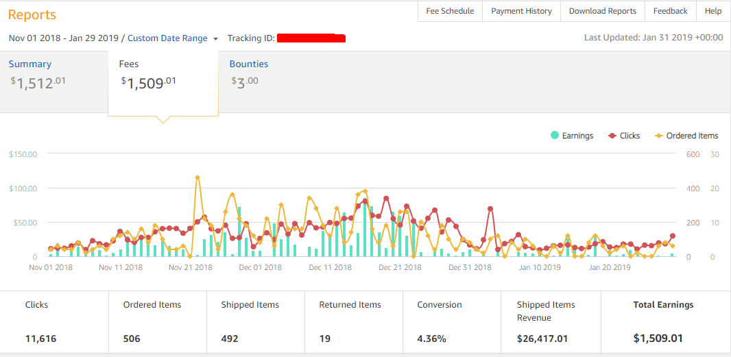 下面是一个亚马逊利基站的例子,一个一年不到的域名,85篇文章,主关键词搜索量2400,三个月1500多美金的收入。