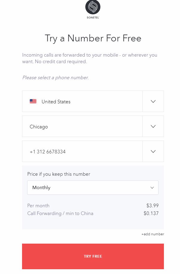Sonetel支持很多国家或者地区的电话号码免费试用。也有些地区不提供试用,比如China。注册过程需要填写邮箱和验证电话,支持国内的电话号码,你也可以找那些临时号码用来接收短信。 初次注册账号有$0.5的免费充值额。
