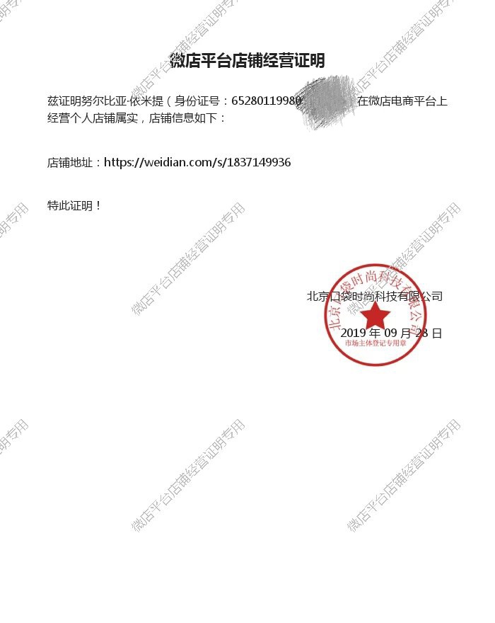 微店开具的“微店平台店铺经营证明”样例↓