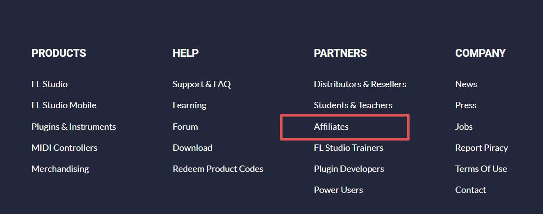 你可以先静下来想想有没有自己熟悉的软件,然后打开官网网站,在网页底部footer那里寻找有没有affiliate 链接。例如上面提到的FL STUDIO ,可以在官网底部发现 affiliate 链接,按照提示一步步申请就可以了。