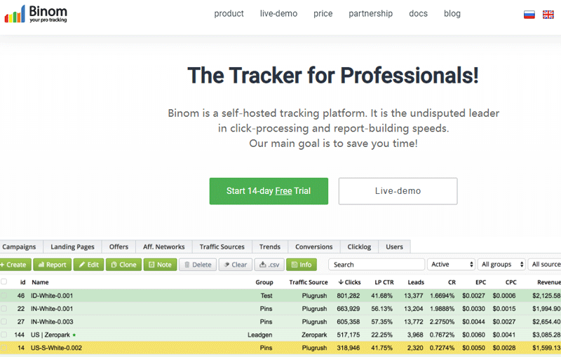 除了iMobiTrax, 其实市面上的追踪系统很多,不过费用都挺高的,最低都要每月六十几美元起。下面给大家介绍一个我个人使用,觉得还不错的追踪系统 binom ,重要的是它提供一个月的完全功能的免费试用,第二个月也有很大的优惠。如果你想进入mobile cpa,刚起步的话,可以试用一下。
