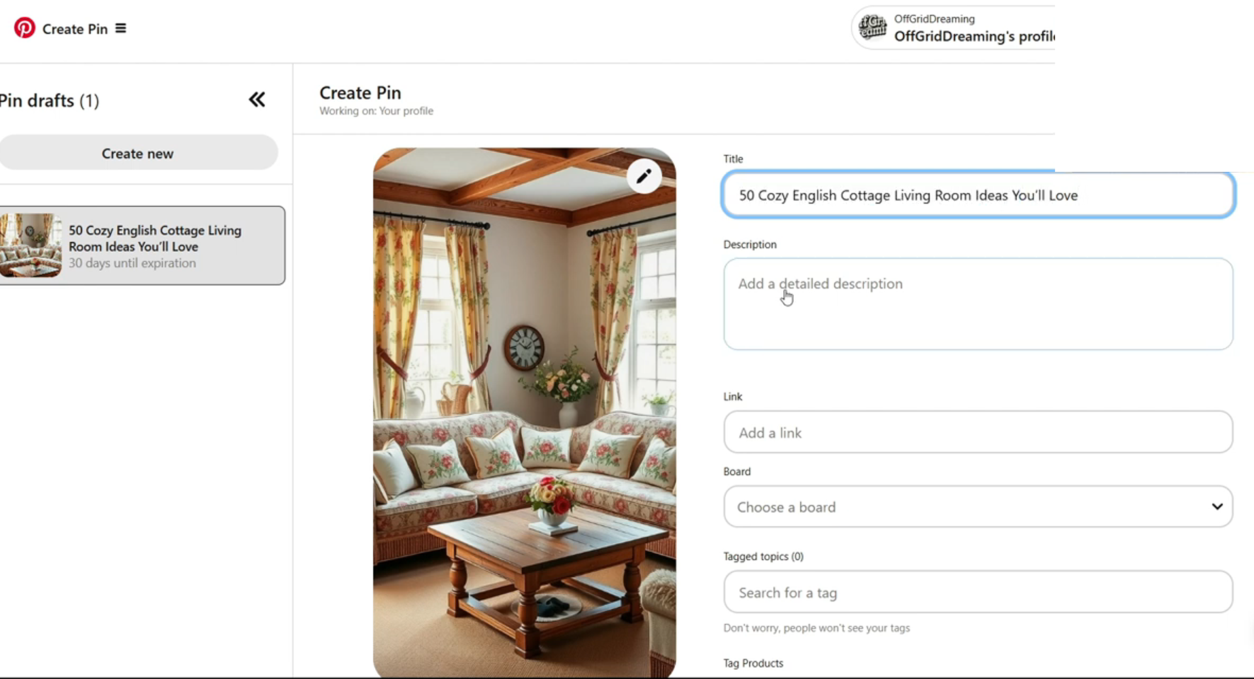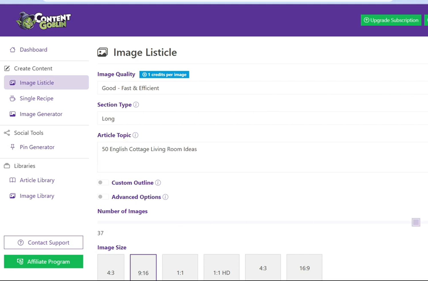 可以在 Pinterest 上输入这个关键词,看看自动提示内容,初步验证关键词热度。如果确定要写 “21 English cottage living room ideas” 这样的内容,可以使用一些工具,比如 “image listicle and content Goblin” 来创建图片。选择 “good” 的图片质量就够了,可以创建 50 张图片,意味着能生成 50 个图钉。