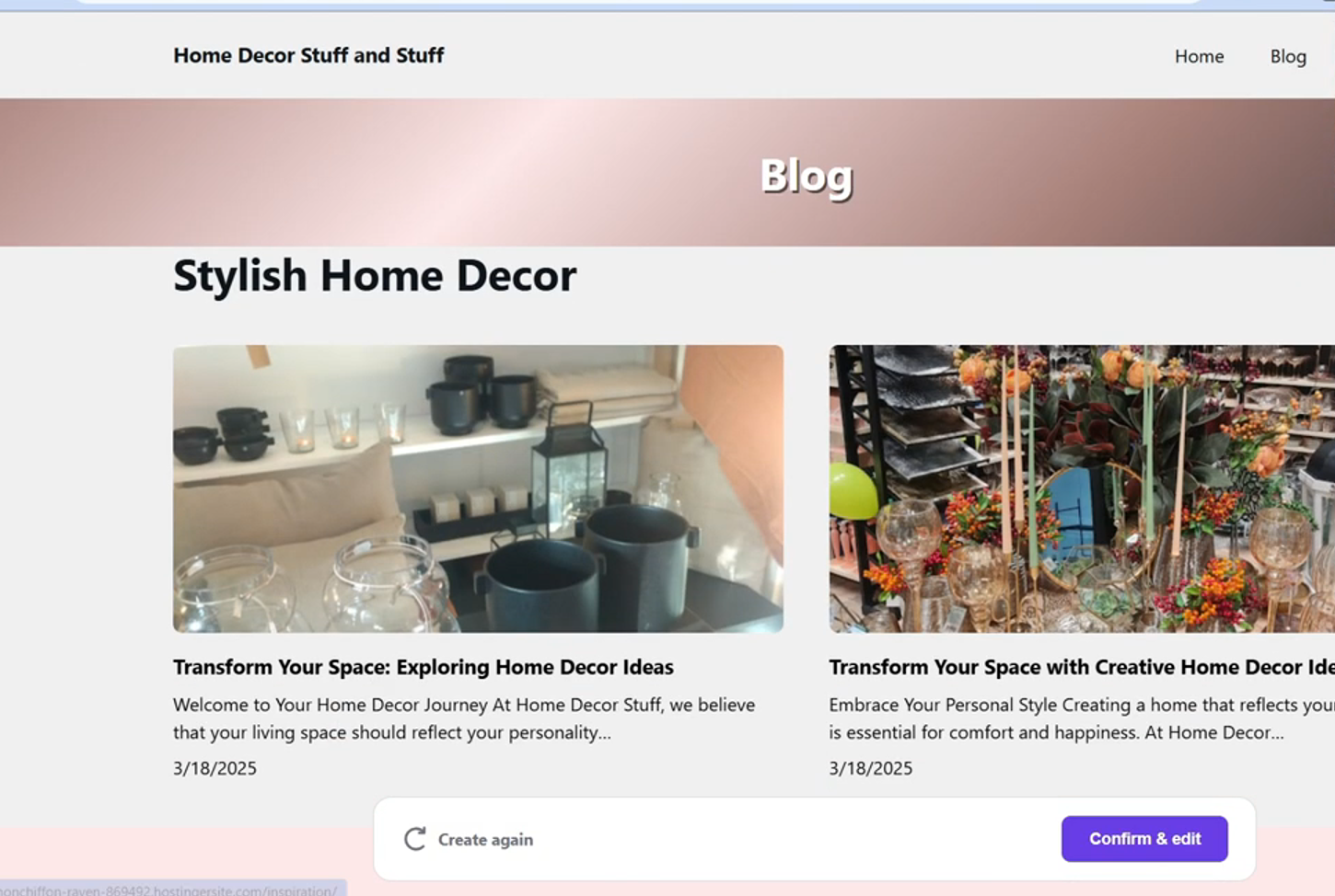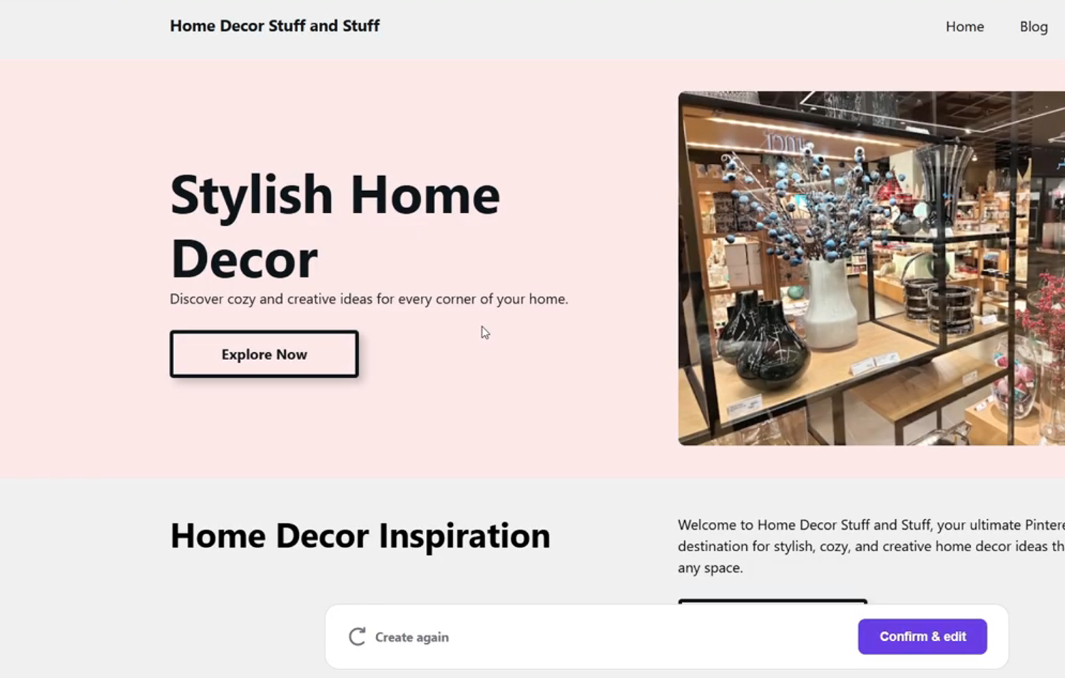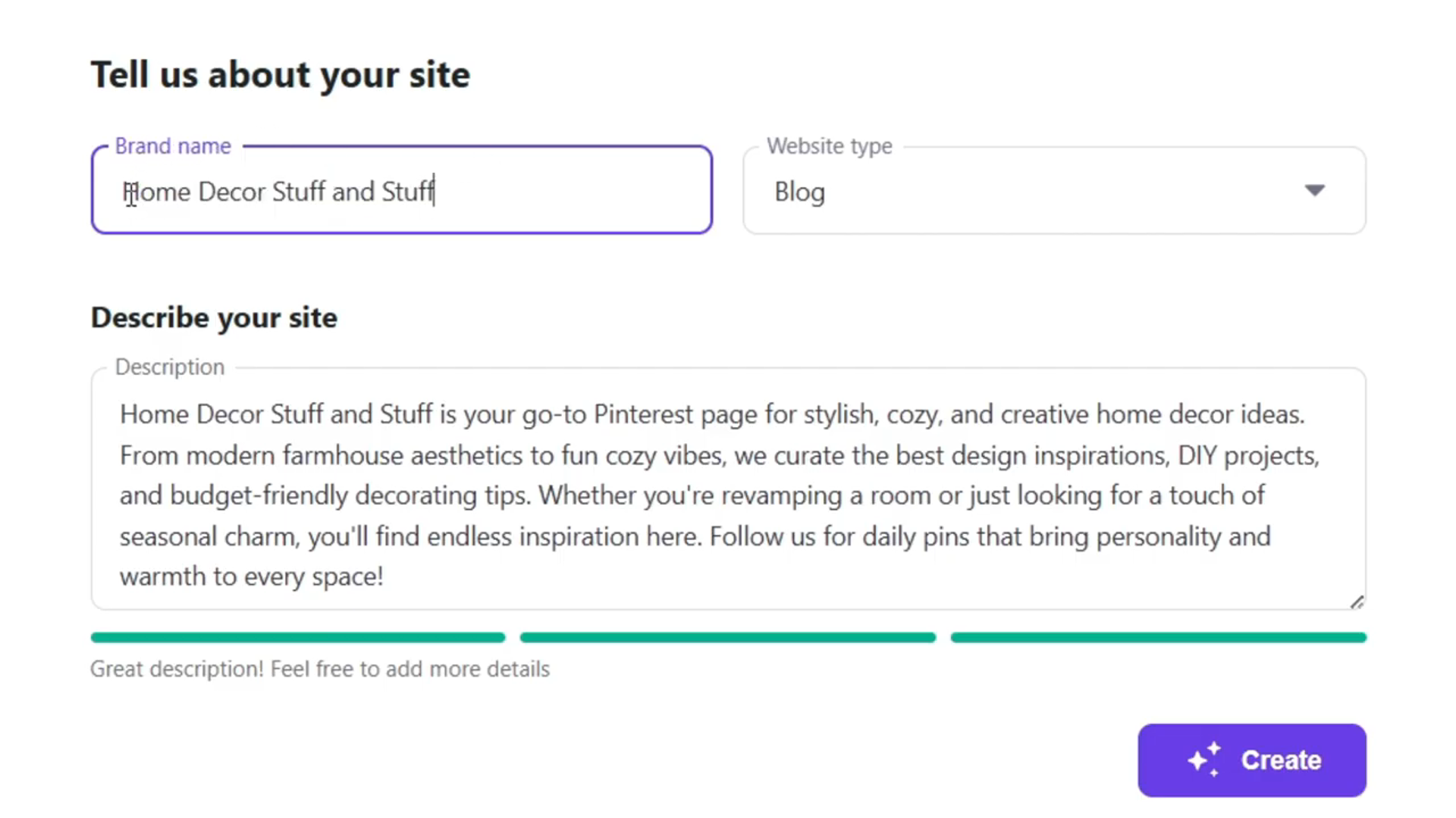 然后需要一个品牌名称,即网站名字,比如 “home decor stuff and stuff”。网站类型选择 “Blog”,描述一下网站,像 ChatGPT 操作,简单描述网站功能和特色。完成后点击 “create”,不到两分钟,一个比 90% 的 WordPress 网站都好的网站就创建好了。