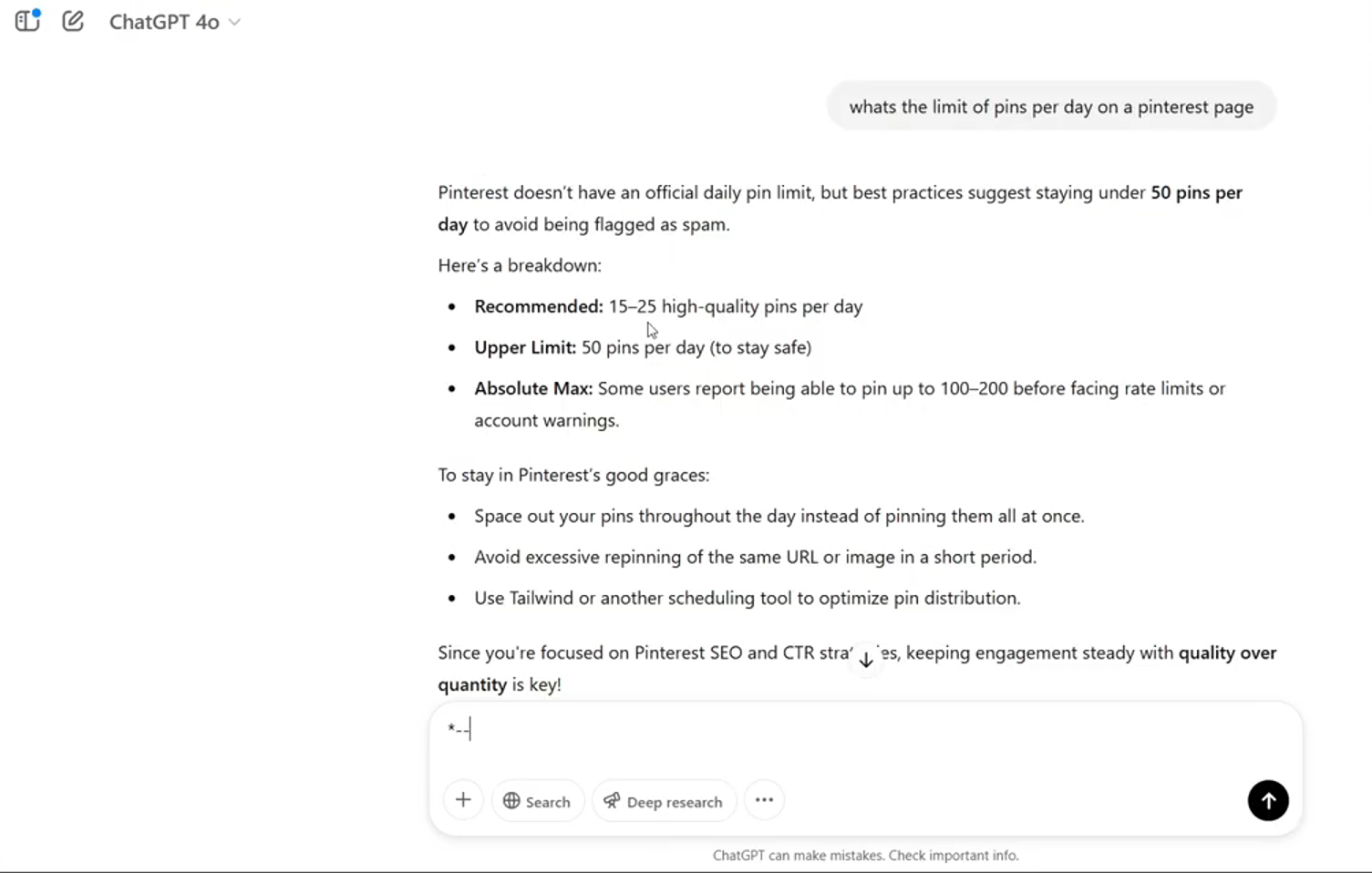 ChatGPT 表示为避免被标记为垃圾信息,每天最好不超过 50 个,推荐 15 到 25 个高质量图钉。