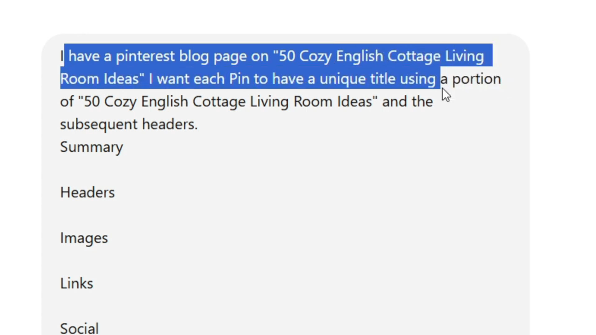 创建好图片后,还需要为每个图钉设置独特标题。这里有个小技巧,使用 ChatGPT。复制博客文章中的 H2 标题,这些标题与图片描述相符,且图片文件名也与描述相符,对 SEO 有帮助。ChatGPT 会根据这些信息为每个图钉生成独特标题。