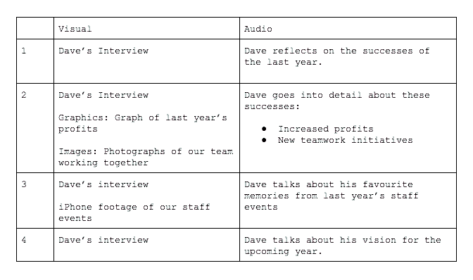 这种格式通过将脚本分成两个不同的列,可以轻松查看音频和视频中发生的情况。如果你是视觉处理者,那么无论你正在创建哪种类型的视频,这都是构建自己的视频脚本的好方法。