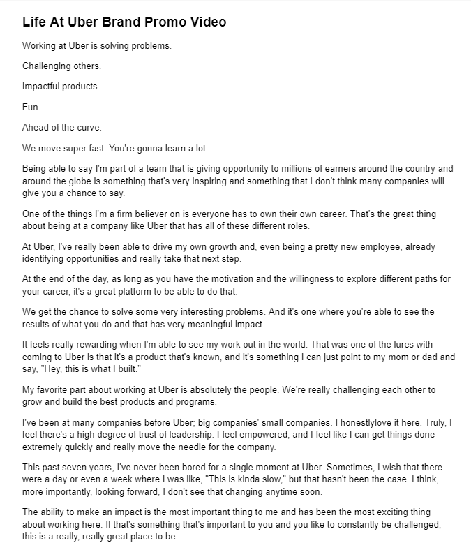 从下面的脚本中可以看出,优步生活视频遵循这种格式。它从对公司的简短但引人注目的描述开始,并引出快乐员工的更详细评论。而且,虽然本视频末尾没有直接的号召性用语,但许多接受采访的员工都提到了下一步——申请优步。