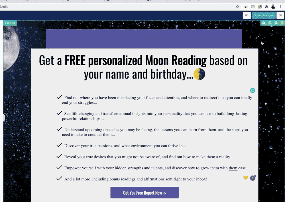 Landing Page有两个选择,最简单的就是一个桥页过度,通过文案和图片引起受众的情绪,并声称提供免费的解读(和广告文案及图片对应),然后加上号召点击的按钮,只有受众点击了链接并且进入到商家的销售页面,并最终购买了服务,我们才能够得到佣金。