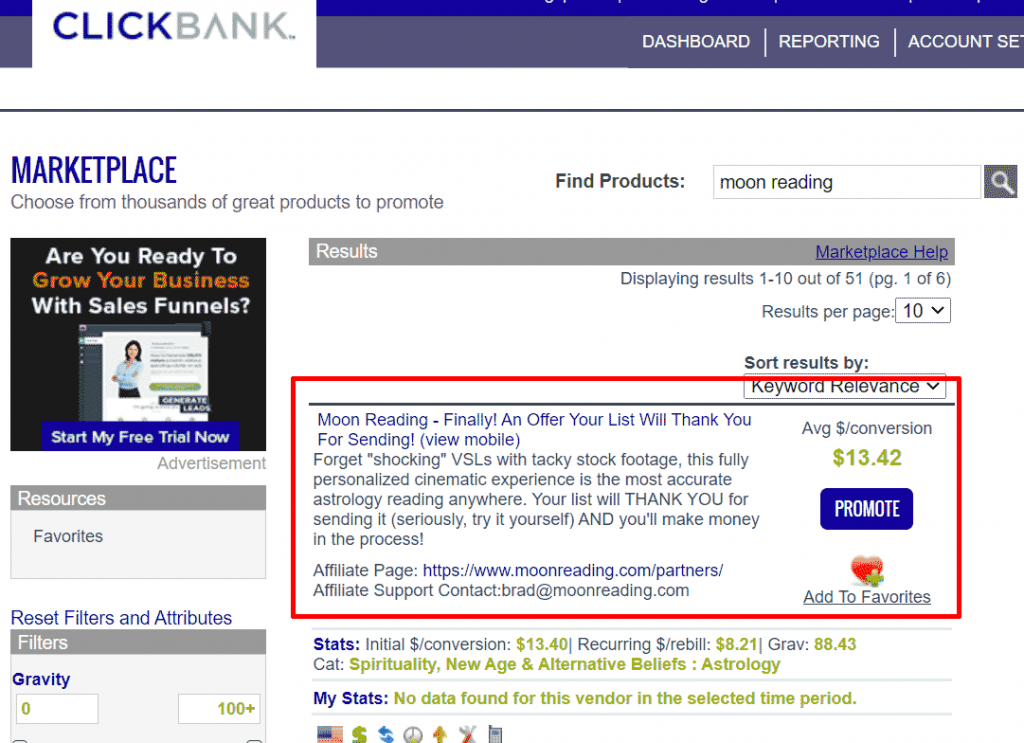 产品选择clickbank联盟中的Moon reading(占星学月亮解读类“玄学”),跟国内的星座分析差不多吧,虽然很多人不信这个,但是也确实也有一类群体深信不疑,权当娱乐也行,总之在国外是非常流行的。 追求精神和灵性成长是一个非常大的利基市场,你点击打开 这个类目,可以发现多个类似的Grav值很高的产品。