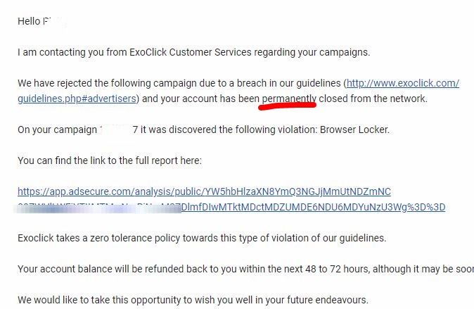 这段时间跑了一段时间Mobile cpa,其中一个流量源就是exoclick。一天突然收到一封来自exoclick的邮件吓了我一跳: