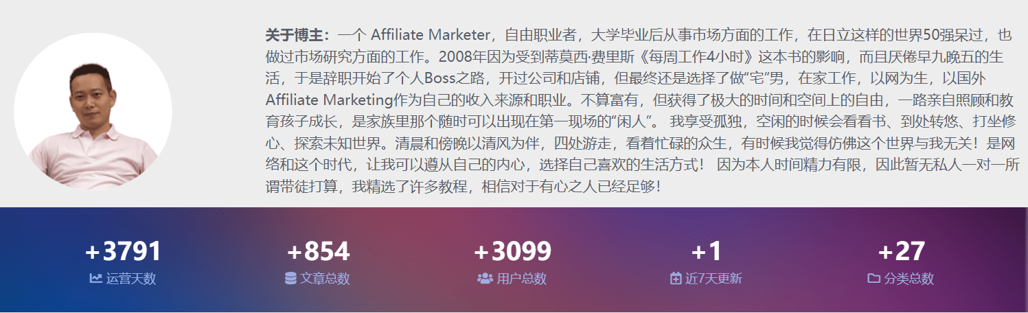 我专职做AM(affiliate marketing)已经好10年+了,不敢说多厉害,养家糊口月入5位数是没问题的。各方面都有涉及,经验是有的,干货、工具也搜罗了很多。相信我有足够的判别力知道 What Works and What is Shit!网站断断续续更新好多年了,看到有好多个读者留言或者QQ告诉我已经看我的博客好多年了,觉得对他们帮忙挺有帮助和启发,希望我多更新,有点感动!这年头博客更新的估计没几个人了!