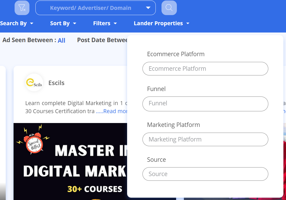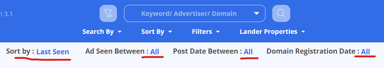 按照lander的结算平台(shopify,magento,clickbank)等过滤,按照漏斗程序(clickfunnel,leadpages)等过滤,按照设备类型(桌面,安卓,苹果,平板)等过滤: