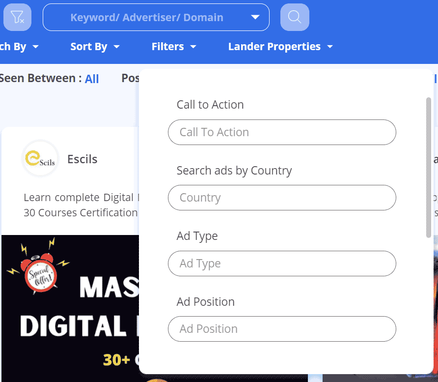 按照call to action内容 ,国家,广告类型(图片或视频),广告位置进行过滤: