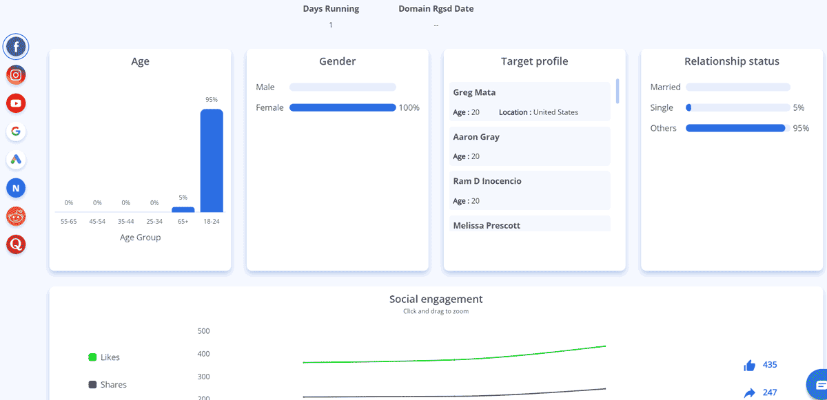 登录之后,它的控制面板如下,最左侧是平台的选择按钮,默认是facebook广告,往下依次是Instagram,youtube,google等广告平台。