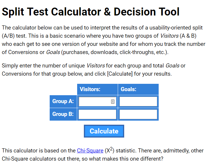 下面的计算器可以用于解释Split Test (A / B)测试的结果。 这是一个基本的情况,您有两组访问者(A&B),他们每个人都可以看到您的网站的一个版本,并跟踪您的转化次数或目标(购买,下载,点击次数等)。