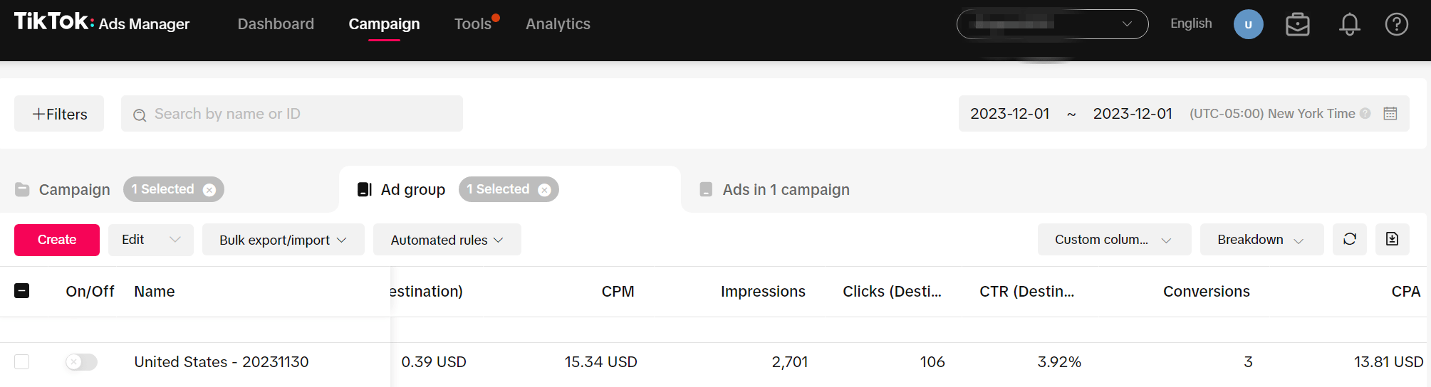 Tiktok 后台大概这样子:(这个是优化Complete payment 事件)12月1日,花了$41(平均每次点击 $0.39)获得了3个 Clickbank的Sale。