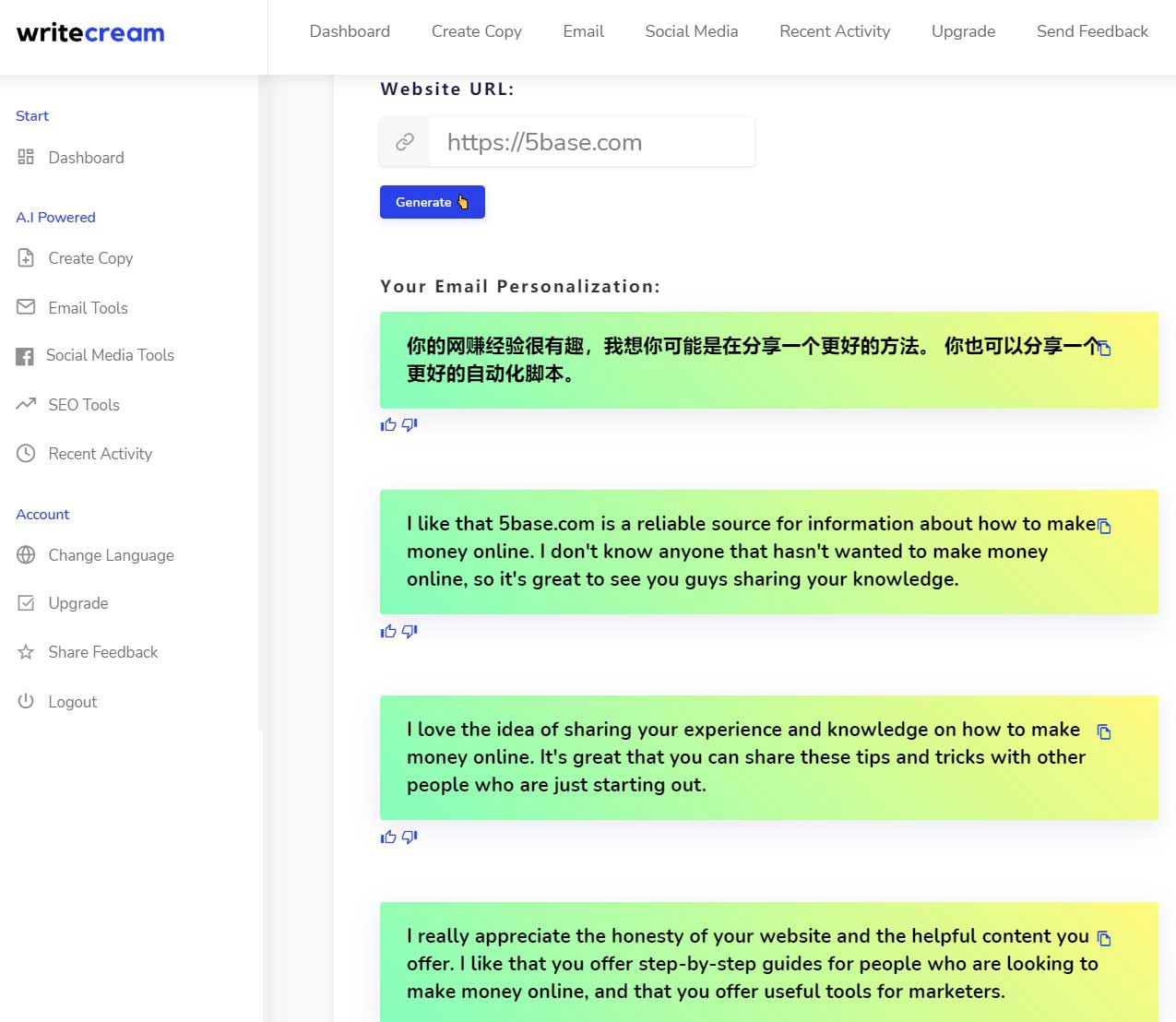Personalized Intros – 个性化的介绍,你主要输入对方网站,或者LinkedIn 页面,就会生成非常个性化的介绍文案,包含了对方网站的主要概括,赞美之词,很容易吸引对方的注意。利用这个Personalized Intros ,不管是给对方发送邮件,LinkedIn招呼,申请友情链接,域名购买等,让对方难以忽视。我测试了一下5base.com这个站:
