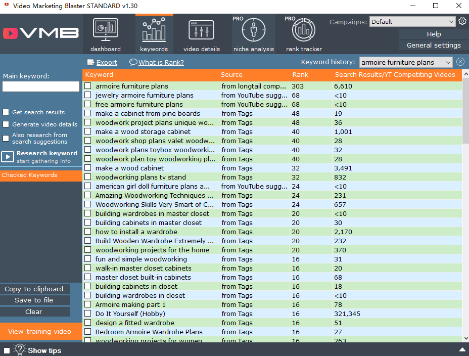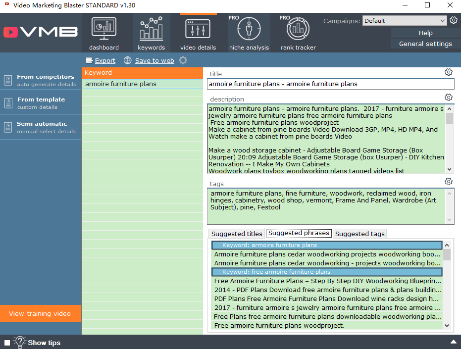 video marketing blaster:可以做关键词研究(竞争激烈程度,排名,tags,关键词)还可以自动生成标题建议,自动建议tags,自动生成视频描述description。
