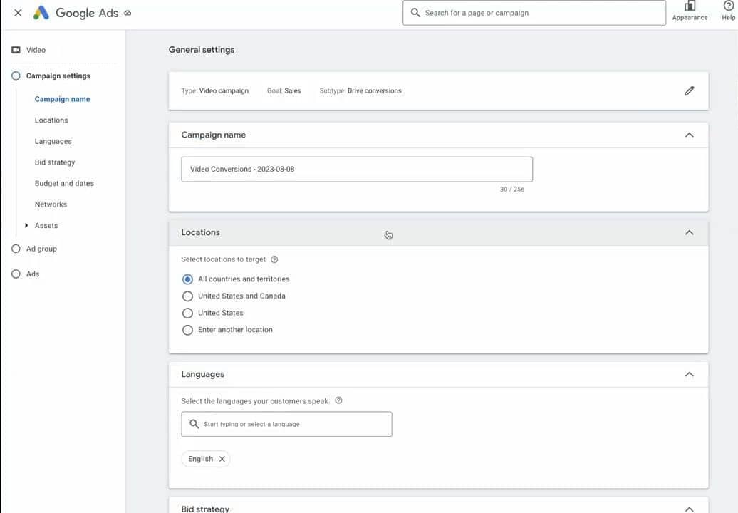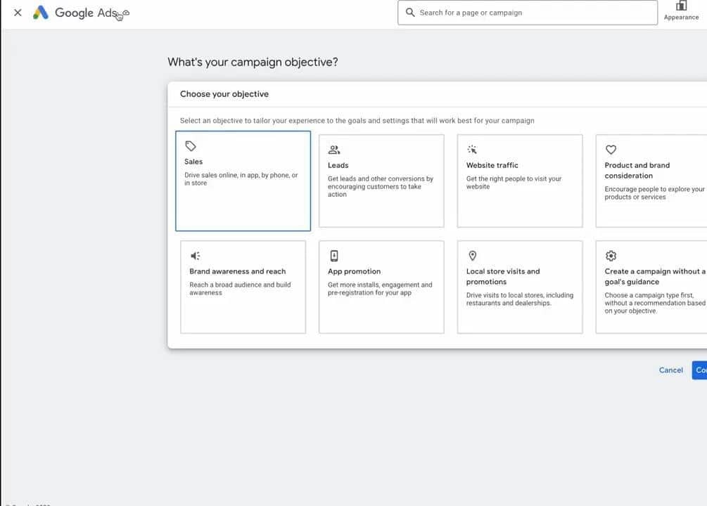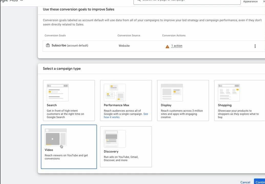 下一步就是使用Google Ad 广告买量,因为你想从你的视频中产生销售,所以选择广告目标为 Sales,然后你点击continue 继续