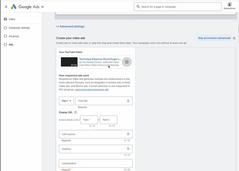 在Ads 这里填写youtube视频的地址,设置一些call to action,headline等要素。