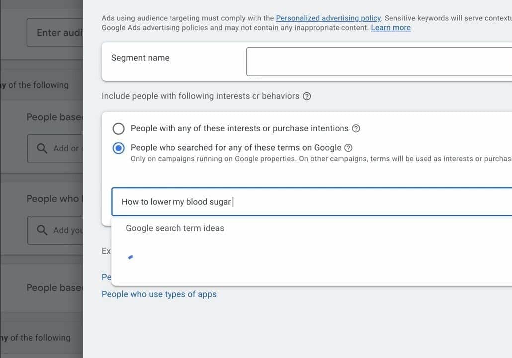 为了更精确的定位目标人群,我们可以在 Audience 这里加上搜索关键词,只显示广告给搜索特定关键词的人群。